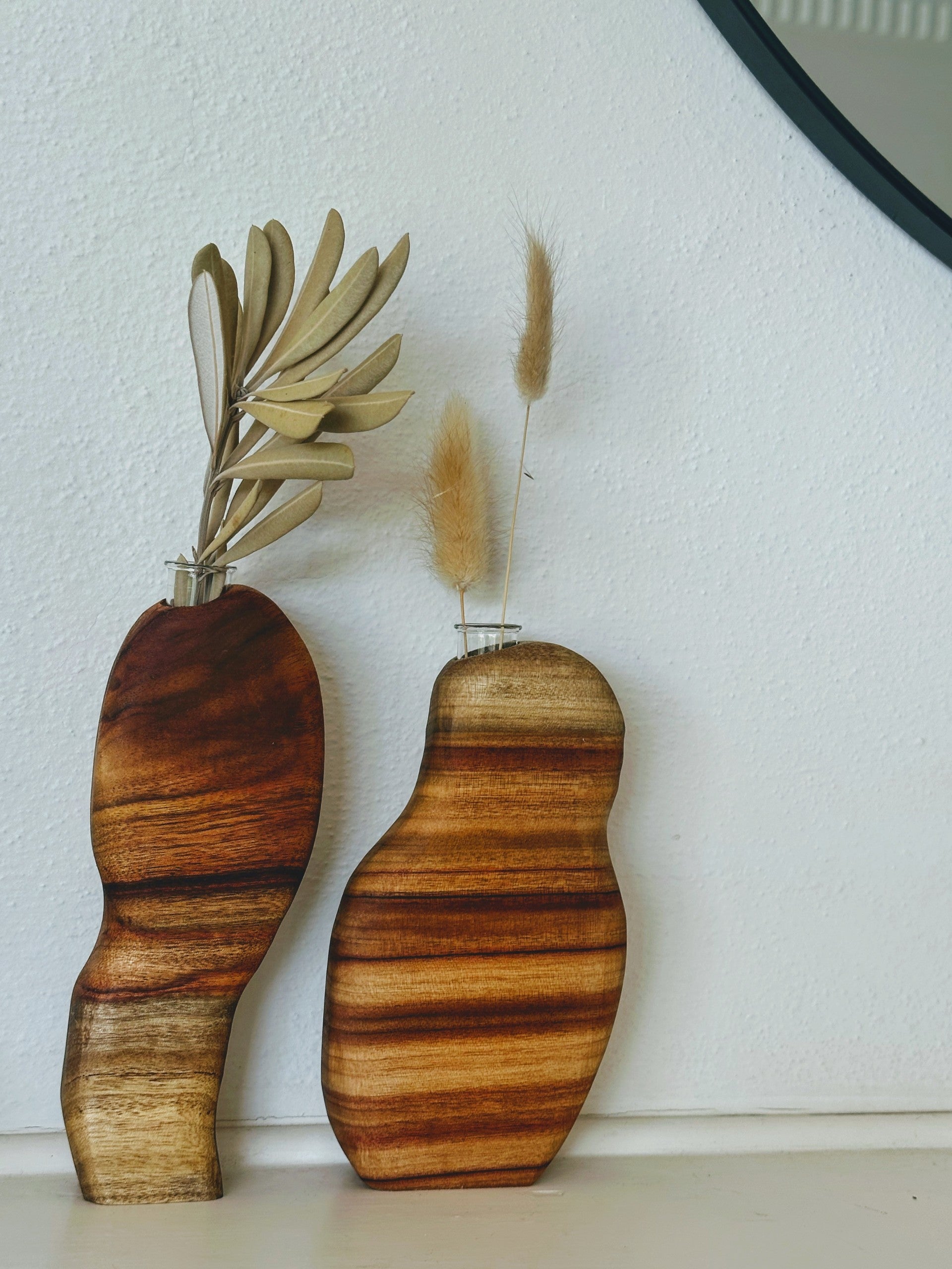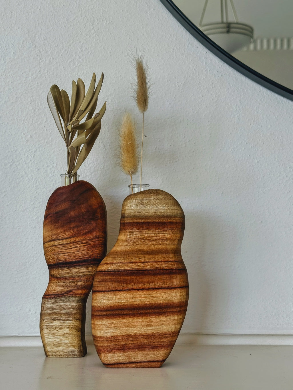 The wobbly vase set was created to celebrate the imperfections of some off-cuts, sculpting them organically and without a predetermined plan, to create a duo of flower vases that are meant to interact with each other.